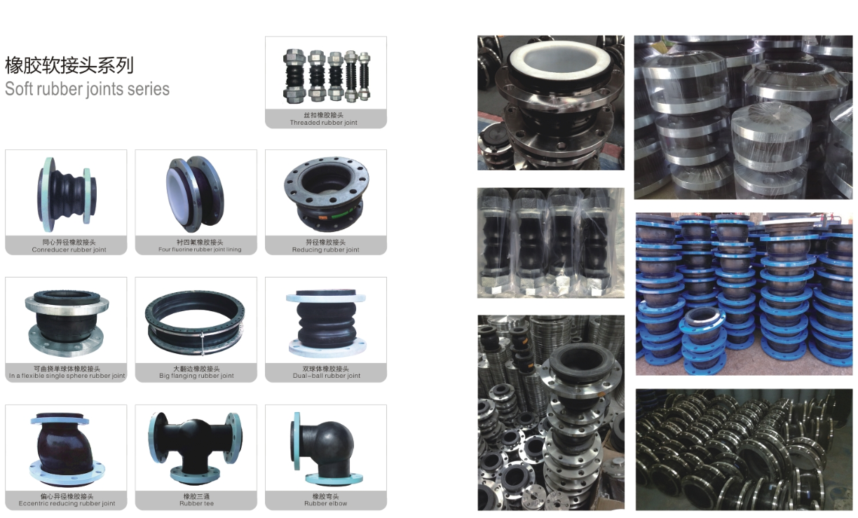 橡膠軟接頭是由內(nèi)外層膠、簾布層和鋼絲圈組成管狀橡膠件,經(jīng)硫化成型后再與金屬法蘭或平行接頭松套組合而成。此產(chǎn)品可降低振動(dòng)及噪聲,并可對(duì)因溫度變化引起的熱脹冷縮起補(bǔ)償作用,廣泛應(yīng)用于各種管道系統(tǒng)。與泵、閥門(mén)的連接、消防器材,震動(dòng)較大的管道、冷熱變化頻繁的管道。主要用于原水和污水的提升和輸送,火力發(fā)電廠的給水和冷卻循環(huán)水,冶金行業(yè),冷凝水,化工行業(yè)的化學(xué)物質(zhì)的管道輸送,石化行業(yè)的冷卻,稀釋及其它行業(yè)長(zhǎng)短距離管線間的柔性連接。因?yàn)橄鹉z具有較高的耐磨性,還適用于一切行業(yè)的粒狀和粉狀及汽體的低溫輸送。