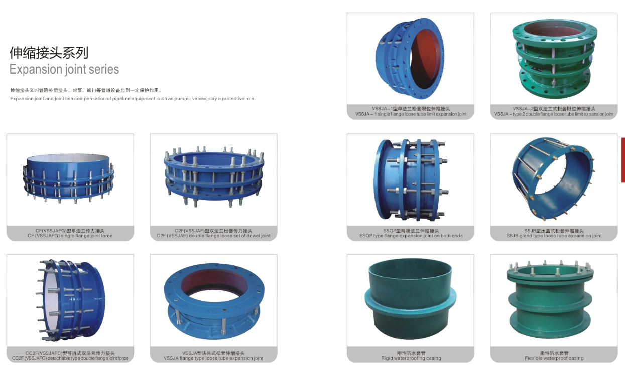 AY型壓蓋式伸縮接頭,AF型法蘭式松套伸縮接頭,BF型單法蘭限位伸縮接頭,B2F型雙法蘭限位伸縮接頭,BY型壓蓋松套限位伸縮接頭,CF單法蘭傳力接頭,C2F雙法蘭傳力接頭等。