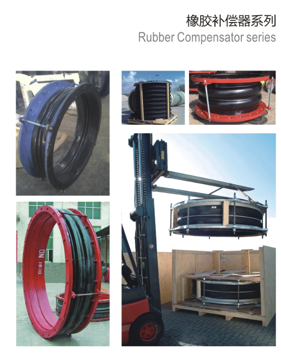 橡膠補償器(又稱橡膠膨脹節(jié)、橡膠伸縮節(jié)、可曲撓橡膠接頭、減振器、管道減震器、避震喉、軟接頭),一般是由兩端帶橡膠凸緣的光滑波形補償元件與金屬法蘭組成。金屬法蘭常采用松套結構。波形補償元件表面為橡膠,內層為數層強力纖維或鋼帶(絲)等加強夾層一直延伸到兩端的橡膠凸緣,凸緣內有硬鋼絲骨架。