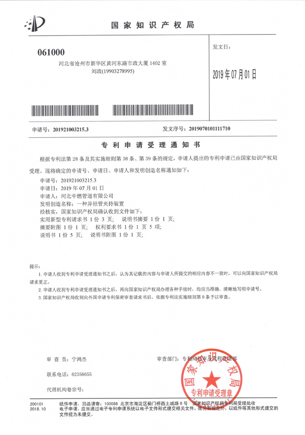 "A Reducing Pipe Holding Device"Notice of Acceptance of Patent Application for
