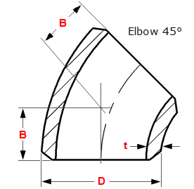 The radius of a 45° elbow is the same as the radius of the 90° LR (1.1/2D). However, the center to face dimension is not equivalent to the radius as in 90° LR elbows. This is measured from each face to the point of intersection of the center lines perpendicular to each other, distances B on the image. This is due to the smaller degree of bend. Short radius 45° elbows are not available.